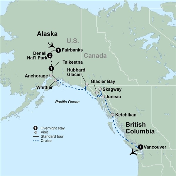 Traverse the Pacific coast by land and sea aboard one of Holland America Cruise Lines lovely ships on a breathtaking journey that takes you from Alaska to Vancouver, British Columbia. This is Alaska as you always imagined.